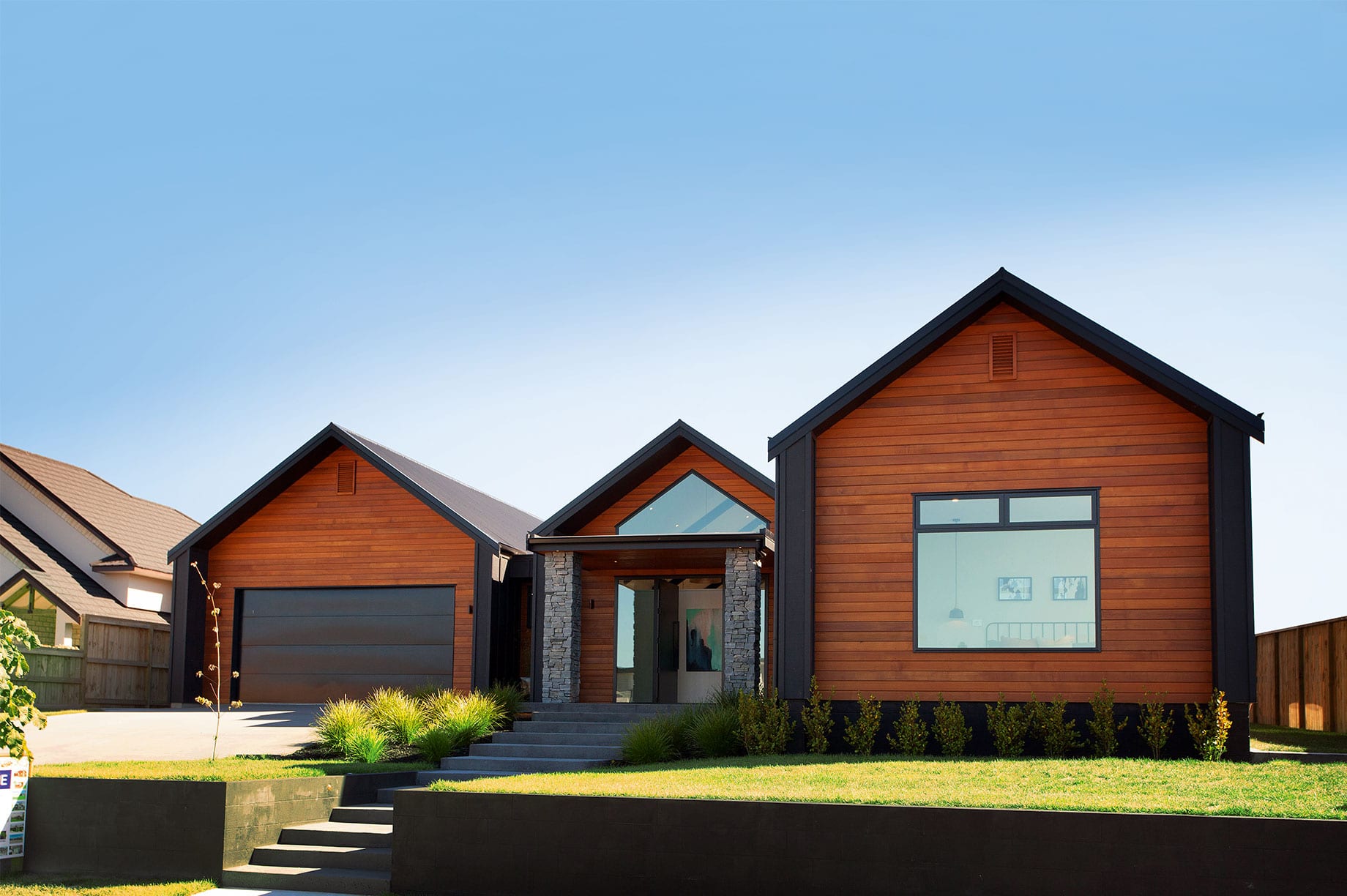 You can enjoy country-style living in modern-day suburbia. Just look at this show-stopping show home in The Meadows of Hamilton with its gabled volumes and rich cladding.
