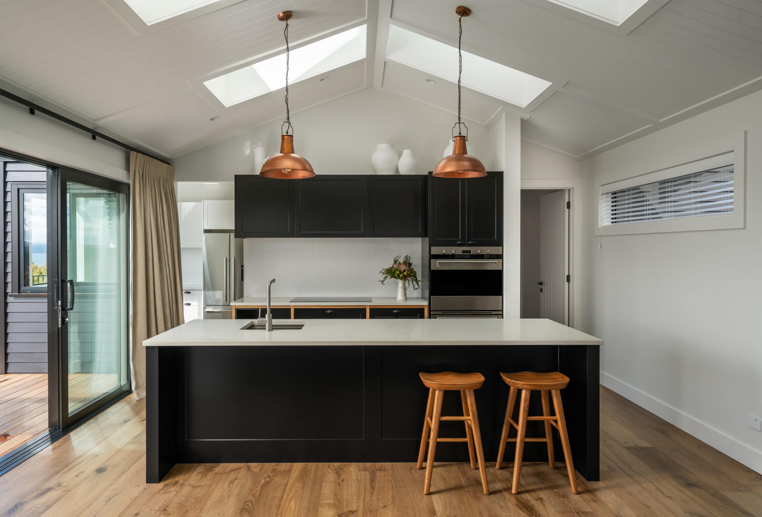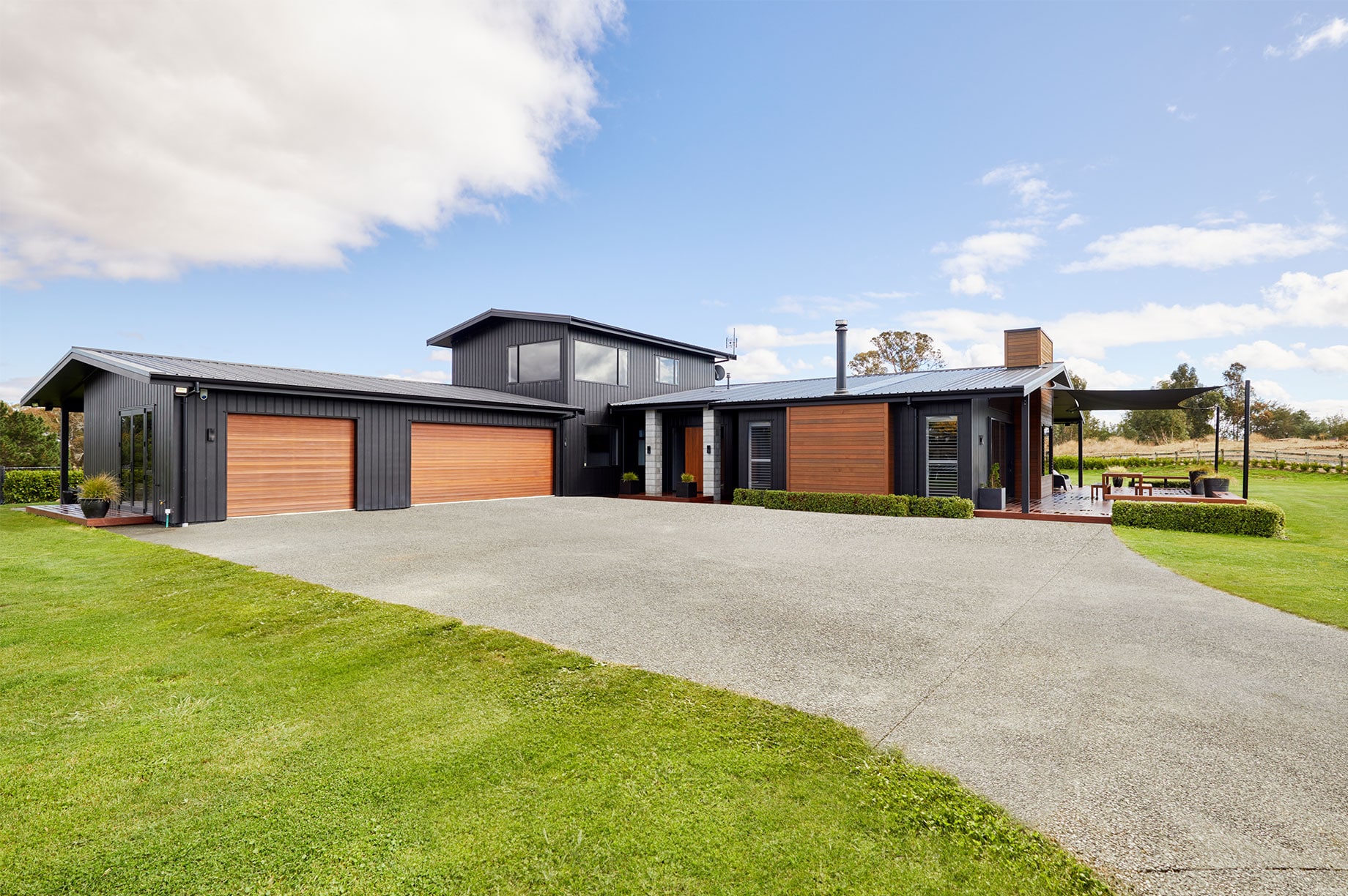 Carefully positioned to maximise sun, the covered outdoor areas, on the east and north, extend the living space into the outdoors. There’s a separate guest or children’s wing, away from the Master suite. Bathrooms are designed for easy use with ensuite access for guests. Among the other superb features are raking ceilings, a high-pitch roof line, and two built-in wood burners. Weatherboard cladding and stone enhance the luxury lakeside lodge feel.