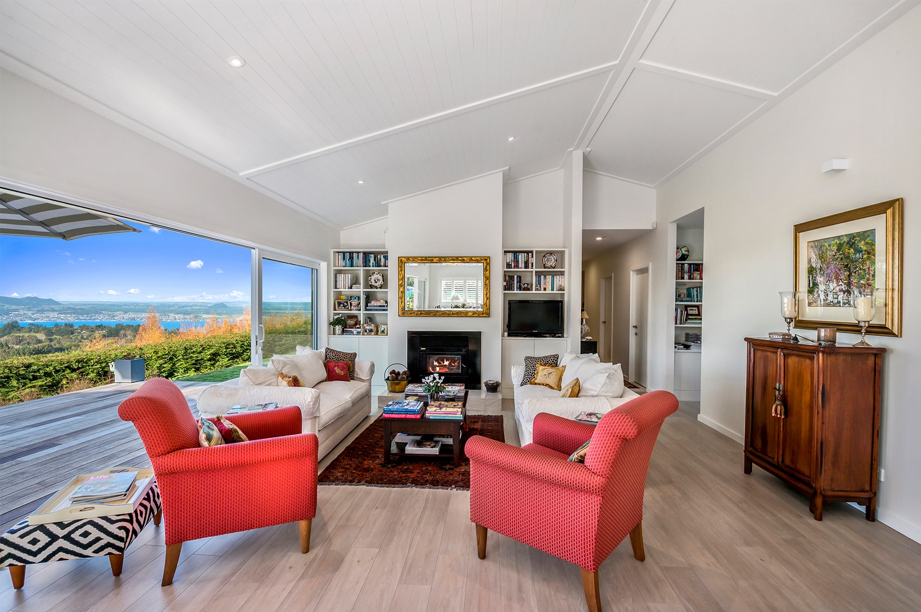 This Acacia Bay escape enjoys the outlook to Lake Taupo and Mt Tauhara from the spacious open-plan living area and its large adjoining deck.